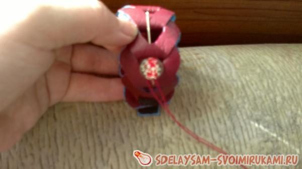 Приступаем к декорированию. Для этого в проделанном отверстии первого звена «в» закрепляем узелок нитки так, чтобы иголка смотрела в глубь браслета.