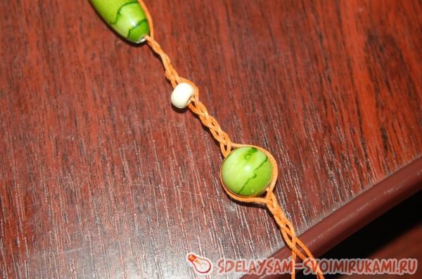2. Начинаем плести косу. Для короткой цепочки достаточно сделать 7 долек косички. В среднюю часть шнура населяем крупный бисер молочного цвета и проплетаем его в косу. Бисер можно окружать шнуром с двух сторон или оставлять только с одной.