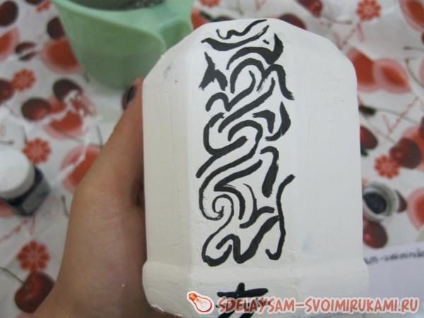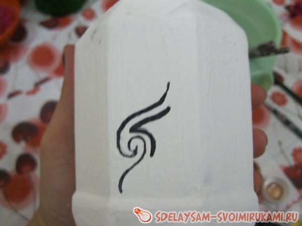Затем выбранным вами мотивом расписываем вазу. Здесь уже фантазии нет предела: можно разрисовать, как желаете, как подскажет душа. Данный мастер-класс демонстрирует роспись в хаотичном порядке, без какого-либо смысла. Так как представленная бутылка имеет грани, то рисунок на них чередуется.