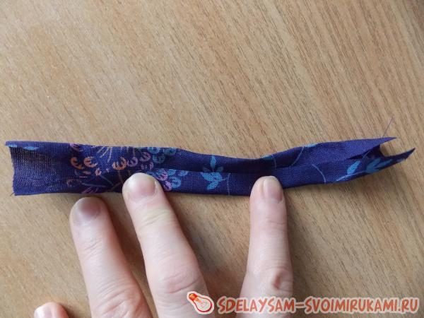 Перевязываем под шариком нитками и, оставив небольшую длину, отрезаем лишнюю ткань. Из цветной полоски делаем повойник на голову куклы: складываем полоску сначала сторонами к центру, затем пополам. Надеваем получившуюся узенькую полоску на голову куклы и перевязываем в районе шеи нитками.