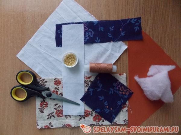 квадрат 6 х 6 см. из цветной ткани. Кроме лоскутов ткани нам понадобятся ножницы, нитки (обычные), ветошь (синтепон), несколько зерен пшена.