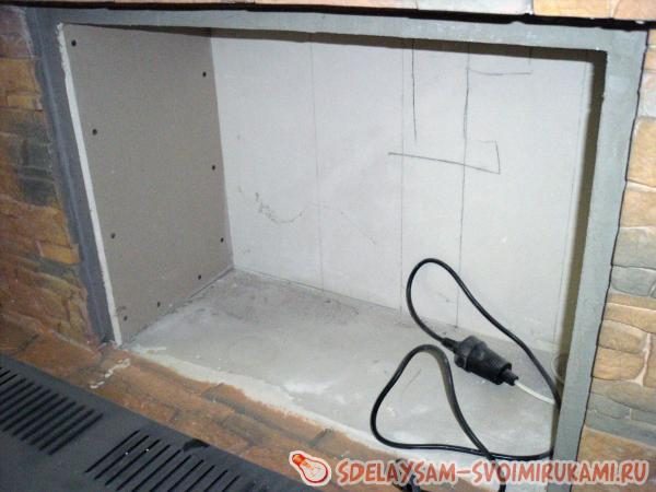 4. Для того чтобы придать «фальшкамину» реалистичности его неплохо украсить декоративным камнем. Как видно на фото, плитки камня укладываются в шахматном порядке, дабы максимально скрыть прямые стыки.