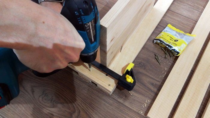 Отпиливаю 3 рейки длинной 565 мм (9 реек 45 мм + 8 отступов для полок 20мм). Беру 2 рейки и скручиваю их под прямым углом.
