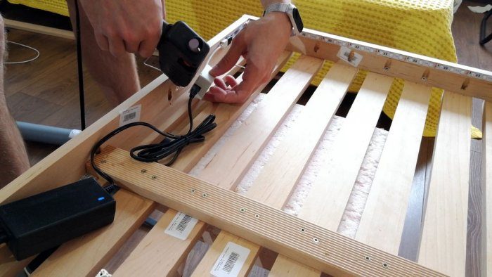 Нашел остатки RGB ленты. Немного подумав, решил пустить ее в дело. Приклеиваю ее по периметру, дополнительно прихватываю термоклеем.