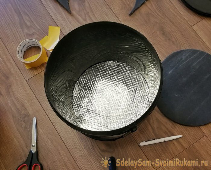 Первый круг буду использовать для утепления дна. С помощью двустороннего скотча, приклеиваю его фольгой вверх.