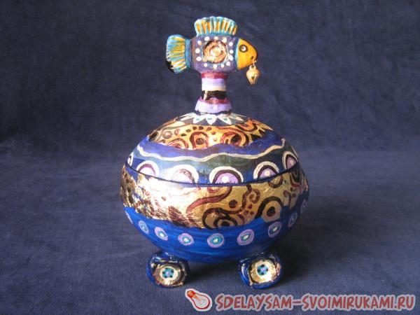 Расцветка готового изделия – дело индивидуальное. В зависимости от образа, который вы создали, представляя вашу будущую шкатулку, подбирается метод и стиль росписи. После раскрашивания, готовое изделие можно покрыть лаком, а если хотите усложнить задачу, можно заняться декупажем. Для шкатулки-рыбки использовался лист потали. Его вполне можно заменить акрилом, имитирующим золото.