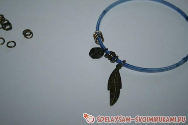 Приступаем к декорированию браслета. Эта часть самая интересная. Начинаем навешивать на браслет кольца и подвески.