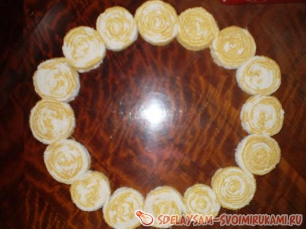 Для начала необходимо заготовить лоскутки, порежьте их длинными полосками и сшейте их пополам, загибая края. Все получившиеся полоски из желтого полотенца я закрутила в форме восьмерки и зафиксировала швейными иголочками. Остальные вещи я также разрезала, сшила из них полоски и закатала в кругляшки. Когда мои заготовки были готовы, начала продумывать дизайн моего изделия, форму и рисунок.