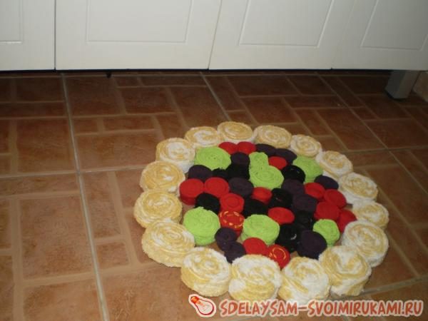 Остановилась на том, что мой небольшой коврик хорошо подойдет для ванной комнаты, сделала его круглой формы. Для окантовки, т.е. внешних краев я использовала все заготовки из желтого цвета, так как их было само много. Сшила их между собой и крепко закрепила нитками слои и загибы. Получился крепкий и плотный круг.