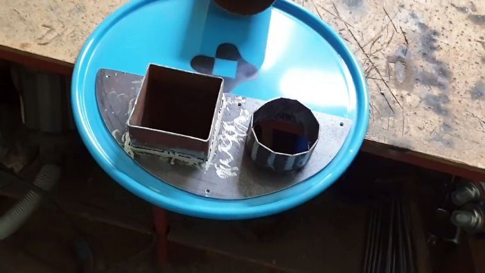 На многогранник насаживаем вытяжную трубу и разводим в топке огонь. Даже в еще не полностью готовой печи возникает тяга и топливо устойчиво горит, причем пламя и дым не выходят из топки, а уходят вниз и попадают в дымовую трубу.