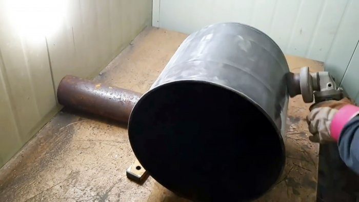 Для того, чтобы удалить краску и наклейки с бака, снимаем крышку, кладем ее сверху и разводим огонь для прокаливания его частей.