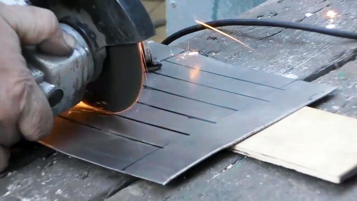 Используя матрицу как шаблон, размечаем металлический лист, предназначенный для изготовления жалюзи. Укладываем его на кусок фанеры с ровной кромкой и, прижав струбциной, выполняем болгаркой по разметке прорези.