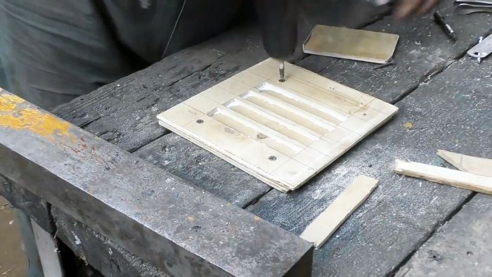 Прижимаем лист к матрице грузом, устанавливаем вдоль прорези листа фанерный «пуансон» и наносим по нему удар молотком. В результате кромка металла прогнется вниз на глубину матрицы. Повторяем эту операцию для всех прорезей металлического листа.