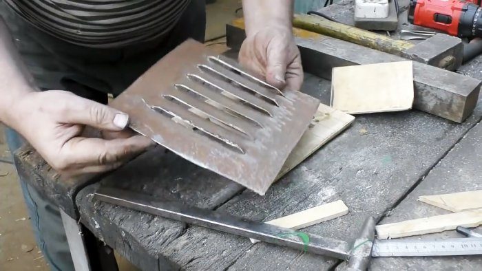Можно сделать и сварную матрицу, используя круглую или профильную трубу, пруток, катанку и т. д. Она может быть для конкретного изделия, но на ней можно изготовить любое количество жалюзи, смещая заготовку на один шаг. Главное, чтобы выходная кромка матрицы была равна по ширине шагу жалюзи. Можно также изготовить два и более ряда жалюзи, перекладывая лист под следующий ряд.