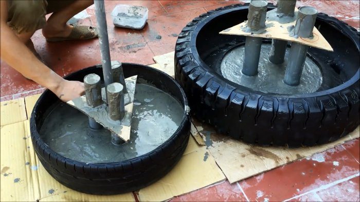 Большая шина укладывается ровно, под нее подстилается картон. Затем до середины ее бортика наливается бетон, в него утапливается сетка с арматурой.