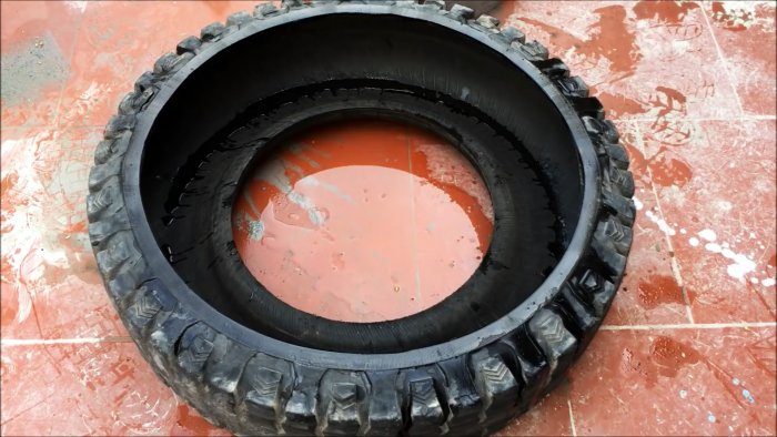 У покрышек среднего и большего размера нужно срезать боковину с одной стороны. Для этого их нужно промыть и смазать по линии реза маслом.