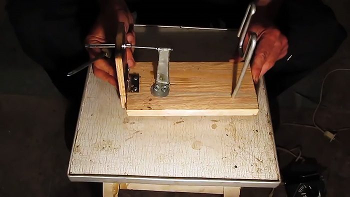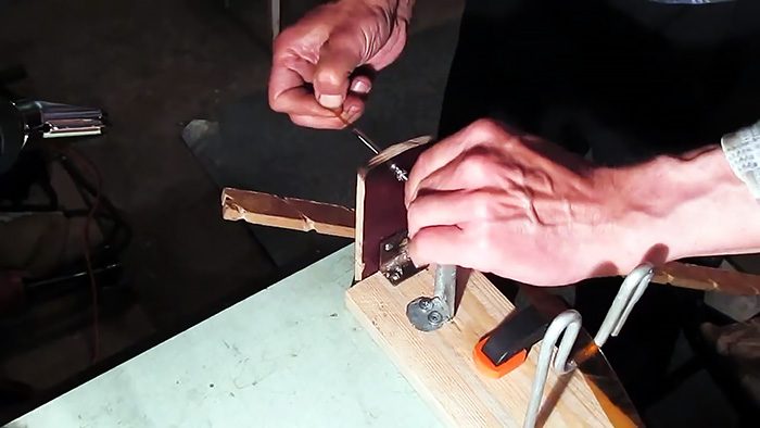 Конусный носик корпуса укорачивается таким образом, чтобы диаметр выходного отверстия составил 3-4 мм. Входное отверстие корпуса нужно немного развальцевать. Доработанный корпус закрепляется на подставке. Затем в него не до конца вставляется гвоздь, для которого делается отдельная стойка. Суть устройства в том, что при протягивании через него нагретой ленты она начнет скручивать в трубочку диаметром 3-4 мм.