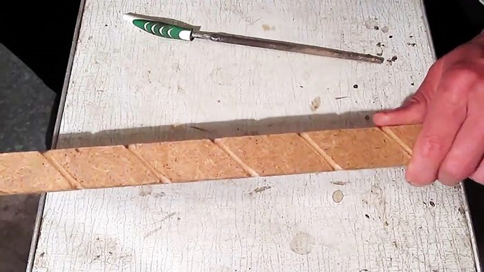 Затем подготавливается направляющая рейка, которая послужит формой для сегментов рабицы. Используется деревянная рейка, полоса фанеры или ДВП толщиной 5 мм. На ней напильником делаются желоба под ячейки с наклоном 45 градусов. Длина рейки должна быть немного больше ширины сетки, которую нужно получить. Ширина направляющей делается в половину желаемой ячейки.