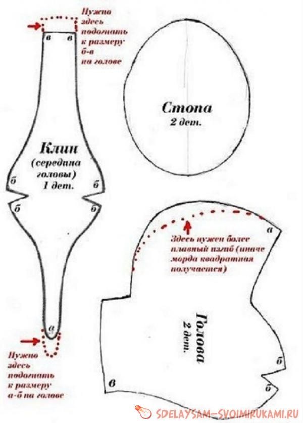 1. Вырезаем выкройку из бумаги, картона или старых газет. Далее вырезаем необходимые детали из ткани. Количество деталей указано на схеме. Тело, лапы, голову и хвост вырезаем из одной ткани, а уши из другой. Для экономии можно использовать старую одежду, которую обычно пускают на тряпки. Я использовала старую белую футболку и старые шорты.