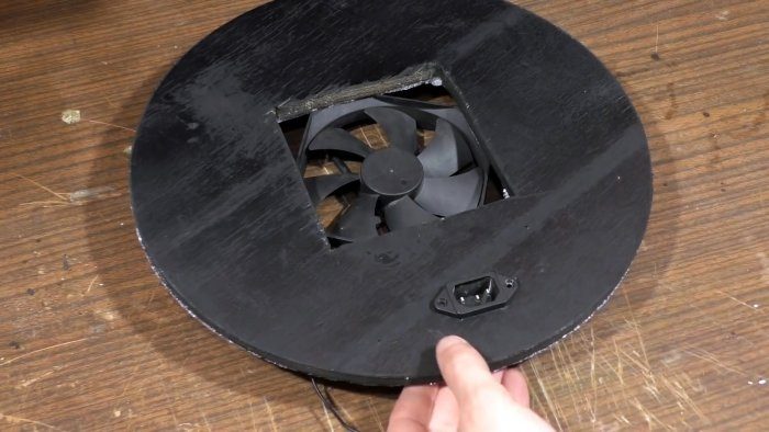В фанере необходимо прорезать окно для установки компьютерного вентилятора.