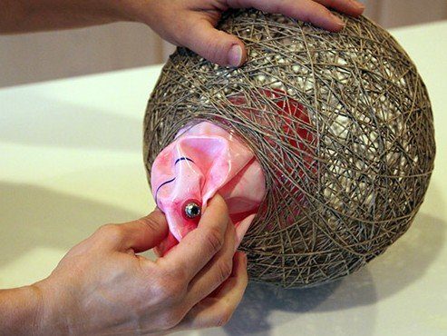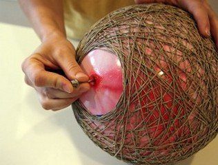 Как только весь мяч будет обернут веревкой,, дайте полностью высохнуть клею, и затем при помощи иглы нужно сдуть мяч, и удалить его из светильника.