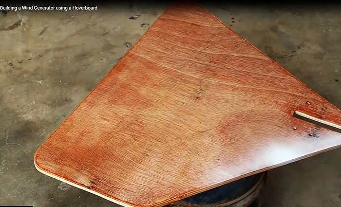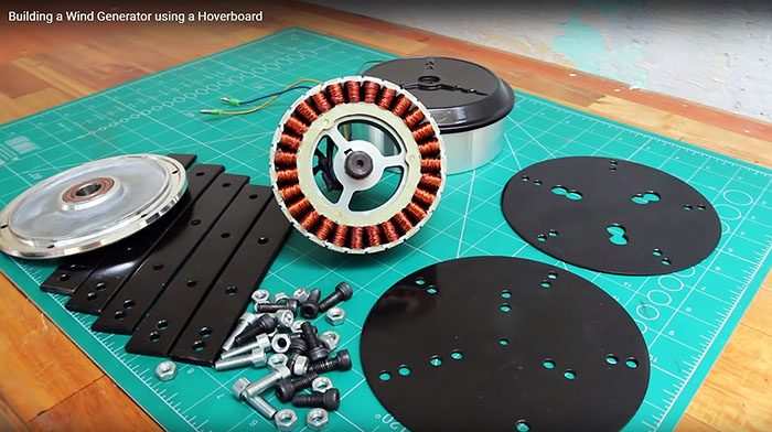 Мотор-колесо и другие детали от старого гироскутера станут оптимальной основой для изготовления ветрогенератора. В качестве хвоста используются фанера, а лопасти вырезаются из ПВХ трубы. Такой ветряк способен вырабатывать мощность до 150 Вт при скорости ветра 5-7 м/с.