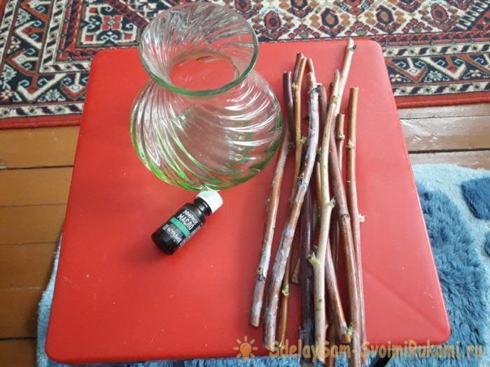 Второй вариант ещё проще первого! Нарезаем ветви малины на отрезки, длиной 18-20 сантиметров, капаем на дно вазы 30-35 капель ароматного масла, и опускаем малиновые отрезки в вазу.