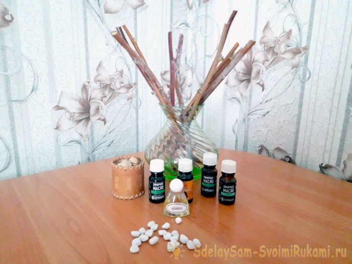 Если рейка очень уж шершавая, можно пройтись по ней наждачной бумагой по дереву. Дальше всё проще простого, укладываем на дно ёмкости (примерно на одну треть ёмкости) вату, капаем на неё 7-10 капель выбранного Вами ароматного масла, засыпаем сверху нарезанные кусочки дерева и на них капаем ещё 7-10 капель того же масла.