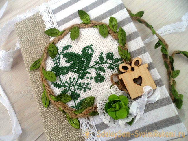 5. Включаем фантазию и украшаем пока еще безликий блокнот. Вышивку можно обрамить веревкой и дополнить мелким декором. Впрочем, данный этап предполагает безграничное количество вариантов оформления.