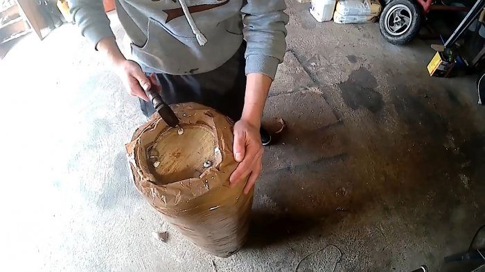 Набивку нужно производить осторожно и постепенно. Если применить лишнюю силу, от удара трамбовки может вылететь деревянная заглушка.
