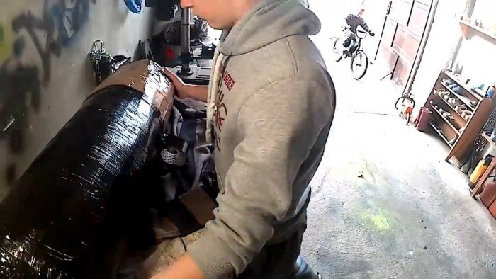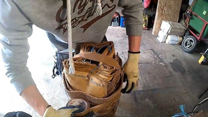 Торцы перекрываем кусками ленты, а основную образующую покрываем путем вращения мешка (в горизонтальном положении) и укладки ленты внахлест. Прорезаем отверстия для доступа к крючкам.