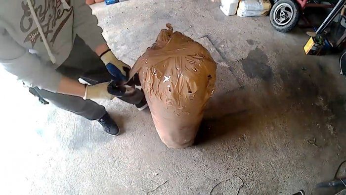 Обматываем мешок упаковочным скотчем. Торцы мешка обматываем кусками ленты, а основную поверхность обматываем внахлест. Прорезаем доступ к деревянной заглушке.