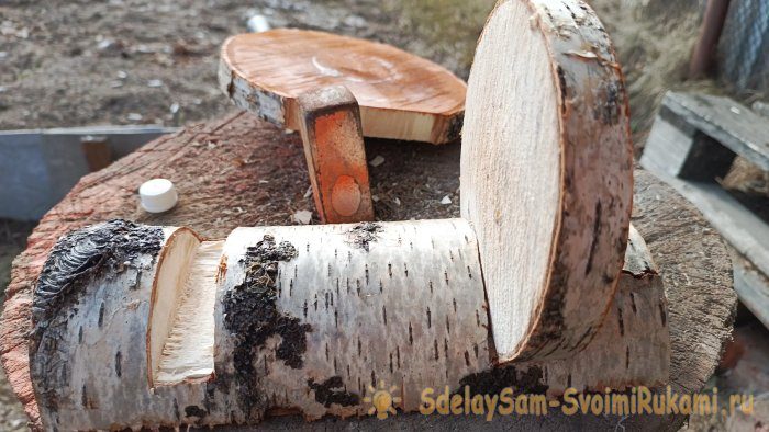 Их можно отыскать на даче. Если у Вас нет дачи, можно поинтересоваться у знакомых и друзей. Не стоит сразу бежать с топором в лес и рубить дерево. Во-первых, это незаконно. Во-вторых, свежая и сырая древесина нам не к чему. Нужны только сухие поленья. При помощи пилы отделяем от чурки не слишком толстый спил. Миллиметров 20. Такой же по толщине спил делаем от чурки меньшего диаметра. В конце самое тонкое полено, миллиметров 100 в диаметре, распиливаем напополам вдоль, и укорачиваем до 25-30 мм. Вот так должно получиться: