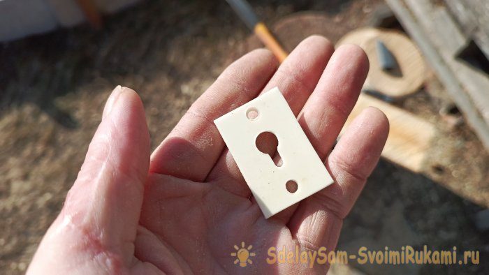 Пластмассовый держатель, который мы ранее вырезали из пластины, прикрепляем поверх углубления, с внутренней стороны основания.