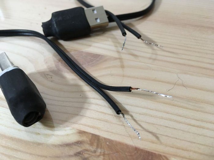 Делаем штекер USB, оголяем и лудим провода. На сам штекер одеваем термоусадку, чтобы провод шел вертикально вниз.