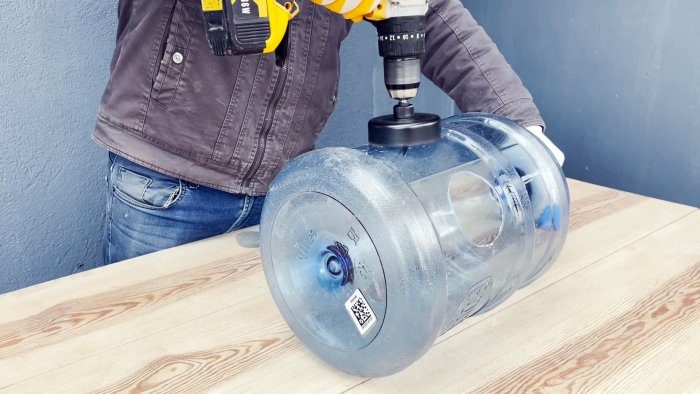 С помощью дрели и коронки просверлите по центру двух бутылей 4 отверстия одинакового размера.