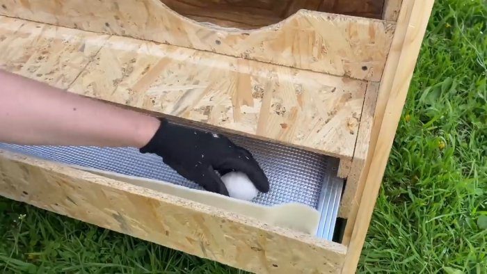 Наклонное дно рамки застилаем мягким утеплителем фольгированной стороной сверху безо всякого крепления. Это позволит в процессе эксплуатации гнезд время от времени вытаскивать его для очистки от различного мусора и дезинфекции.