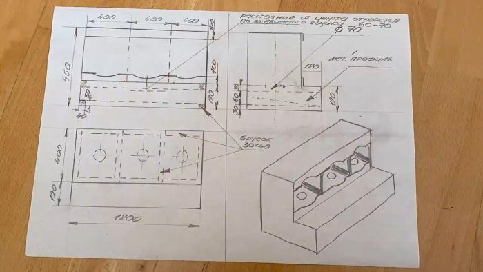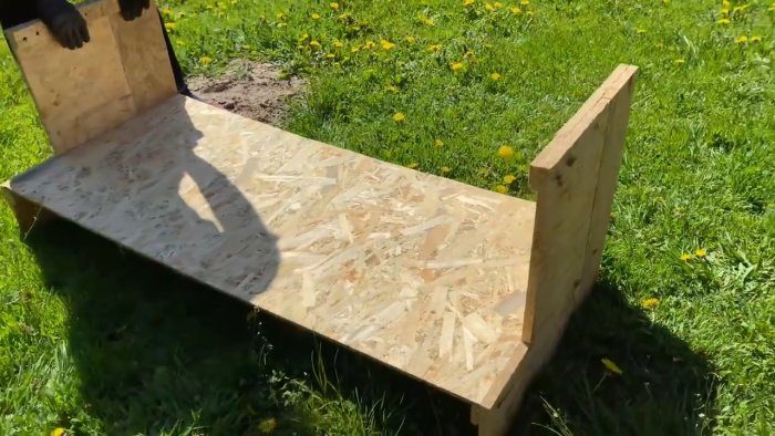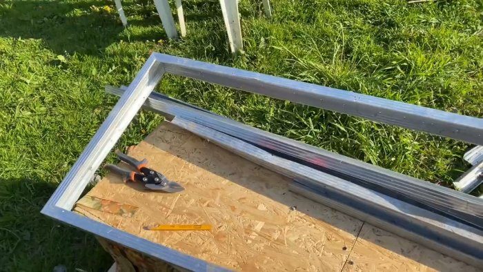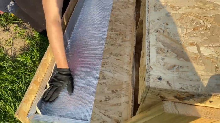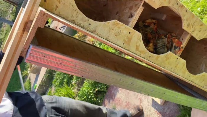 В П-образном металлическом профиле по разметкам вырезаем ножницами по металлу просечки и сгибаем его в раму прямоугольной формы. Крепим к полученной раме с уклоном на высоту профиля лист из OSB соответствующих размеров, используя деревянные бруски.