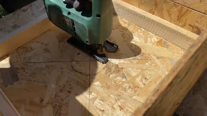 В гнездах по основанию проводим диагонали и находим их центры. С помощью круга диаметром 7 мм, вырезанного из OSB, в центре наносим окружности, которые затем вырезаем с помощью лобзиковой пилы. Шлифуем кромки круглых вырезов наждачной бумагой.