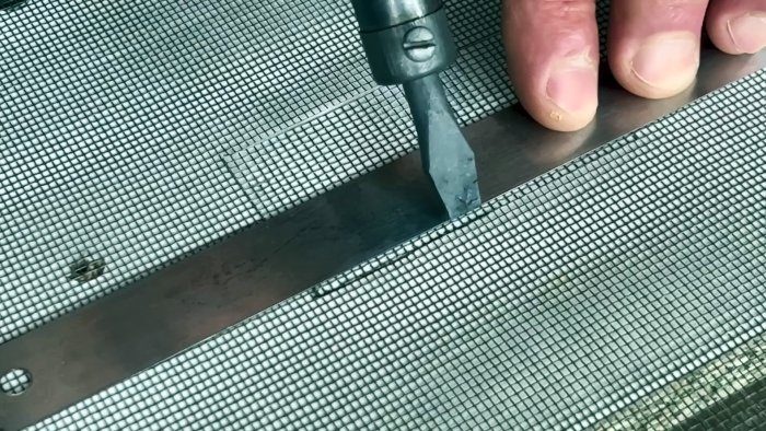 Укладываем её на место. Далее – самый ответственный момент. Возьмём паяльник и, придерживая заплатку всё той же металлической линейкой, аккуратно начинаем «припаивать» заплатку к основе. Москитные сетки изготавливают из пластика и под действием температуры паяльника, заплатка и сетка начнут сплавляться.