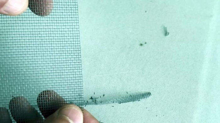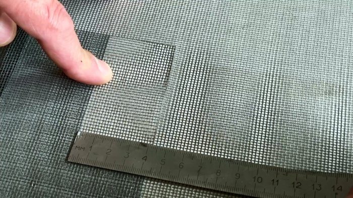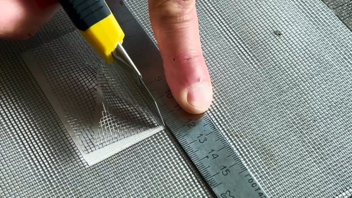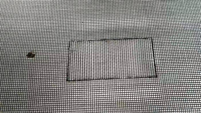 Снимаем москитную сетку с окна и укладываем её на ровную поверхность. Удобно, если поверхность белая – она контрастирует с темной сеткой. С помощью стальной линейки и сегментного ножа вырезаем поврежденный участок. Вырез делаем в виде прямоугольника. Так будет удобнее в дальнейшем при изготовлении заплатки.