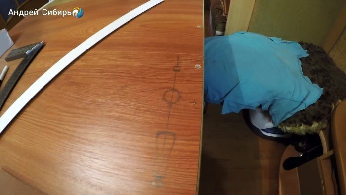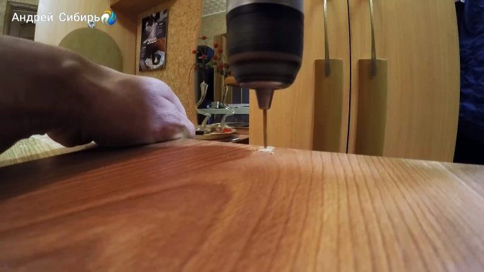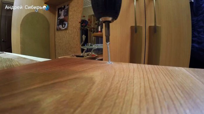 С двух краев доски ламината по центру, отступив от края 10 мм, сверлим отверстия и вход в них рассверливаем битой под головку саморезов. Метизы закручиваем без фанатизма, т. к. их еще придется слегка ослаблять.
