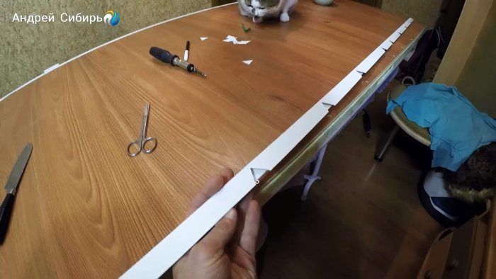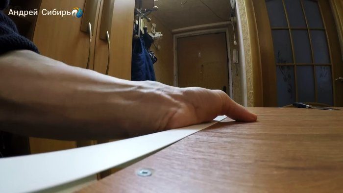 Со стороны двери без навесов установка заглушки происходит несколько по-другому. Переворачиваем заглушку, размещаем ее над ламинатом так, как она будет окончательно установлена, и вырезаем треугольные пазы напротив каждого самореза, чтобы при установке заглушки на кромку двери она не упиралась в саморезы. Торцевые заглушки устанавливаем аналогично внахлест или под угол 45 градусов.