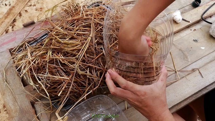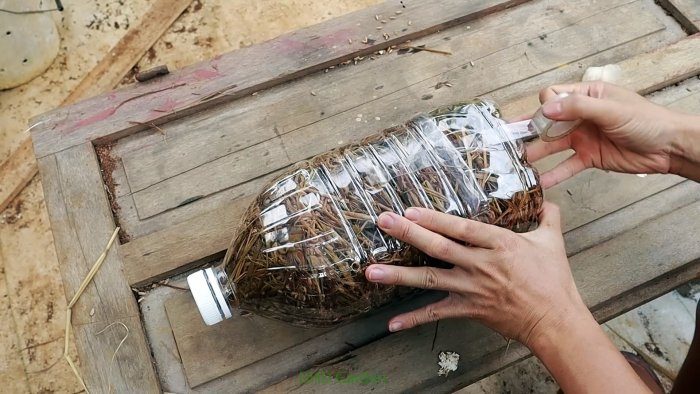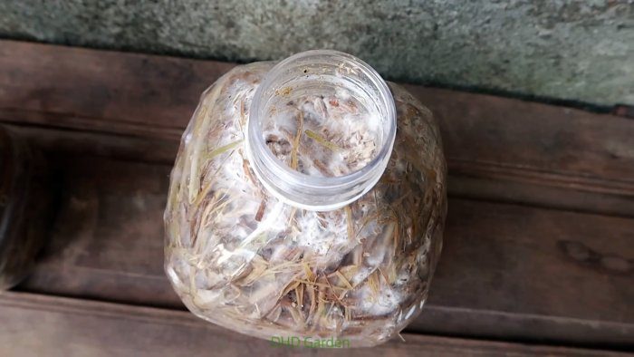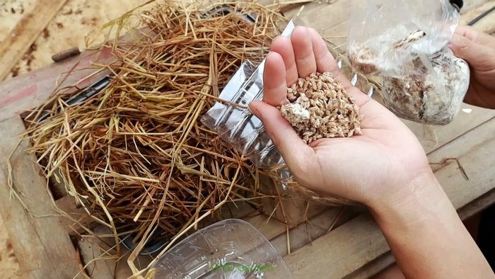 Высыпаем немного мицелия, опять делаем слой соломы и повторяем так несколько раз до полного заполнения. Утрамбовываем солому очень плотно, чтобы бутылка была максимально заполнена.