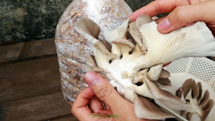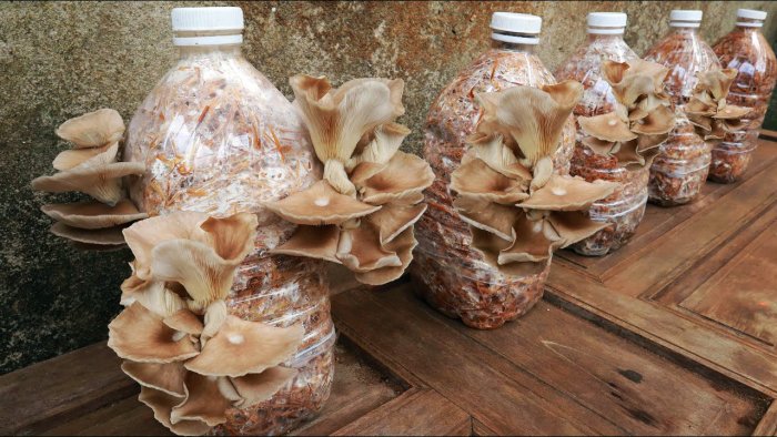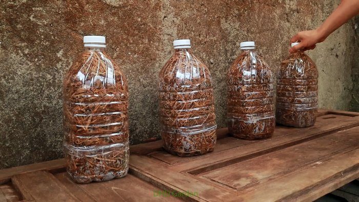 Можно также открутить от бутылок крышки и поливать конструкцию прямо в горлышко. Главное – не переборщить и устроить грибам теплое и влажное место.