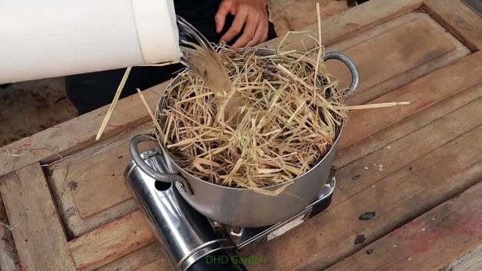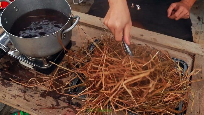 В кастрюлю плотно укладываем солому, заливаем чистой (лучше дождевой) водой и ставим на огонь. Кипятим в течение 30 минут.