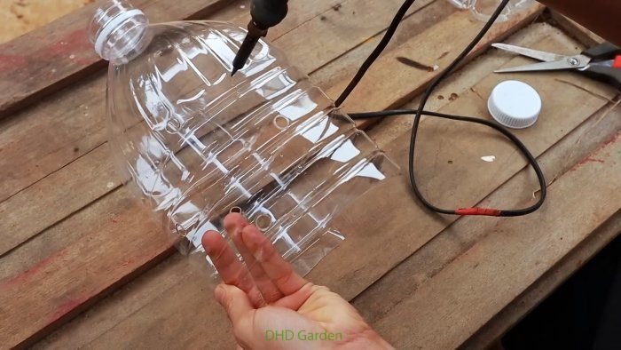 В верхней части делаем несколько вертикальных надрезов и одеваем ее обратно на нижнюю. С помощью нагретого паяльника выпаиваем несколько отверстий шириной 1-2 см. Располагаем их таким образом, чтобы в высоту было 3-4 кружочка. Если нет паяльника – можно воспользоваться обычным гвоздем или металлической палочкой, которую следует нагревать над огнем. Ну а если нет желания, самый простой вариант – просто вырезать ножом или ножницами данные отверстия.