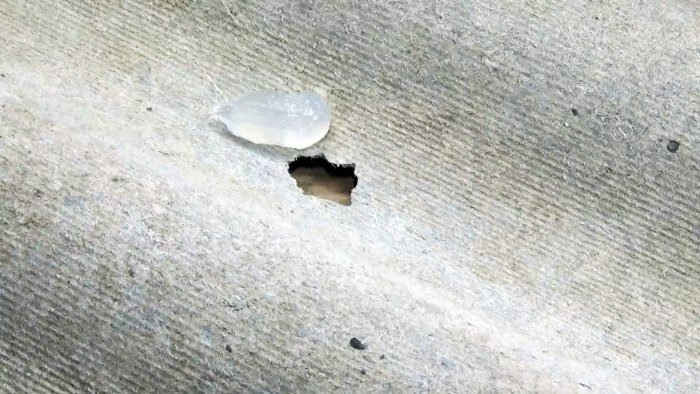 В зависимости от размера повреждения, можно выдавить несколько горошин герметика и распределить его по поверхности шифера, отступив от края дырки на 1-2 см. Для удобства, можно использовать пенковый утеплитель, чтобы размазать герметик.