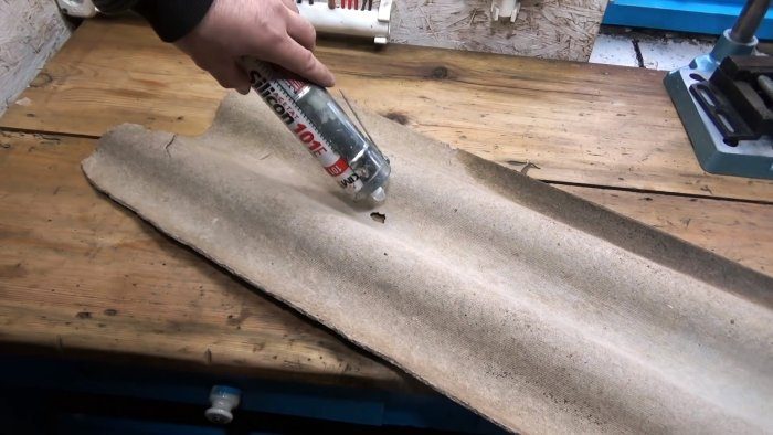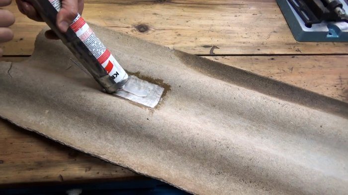 После того, как герметик был нанесен на шифер, нужно приложить ткань и придавить ее в тех местах, где она прилегает к краям шифера.