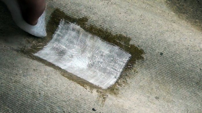Когда ткань пропитается герметиком и надежно соединится с шифером, сверху можно нанести еще немного герметика и так же распределить его по ткани. В этом случае важно распределить герметик за края ткани, чтобы он запечатал ее края. Это предотвратит отклеивание тканевой латки и протекание воды во время дождя. Для полного высыхания материала требуется от 12 до 24 часов.